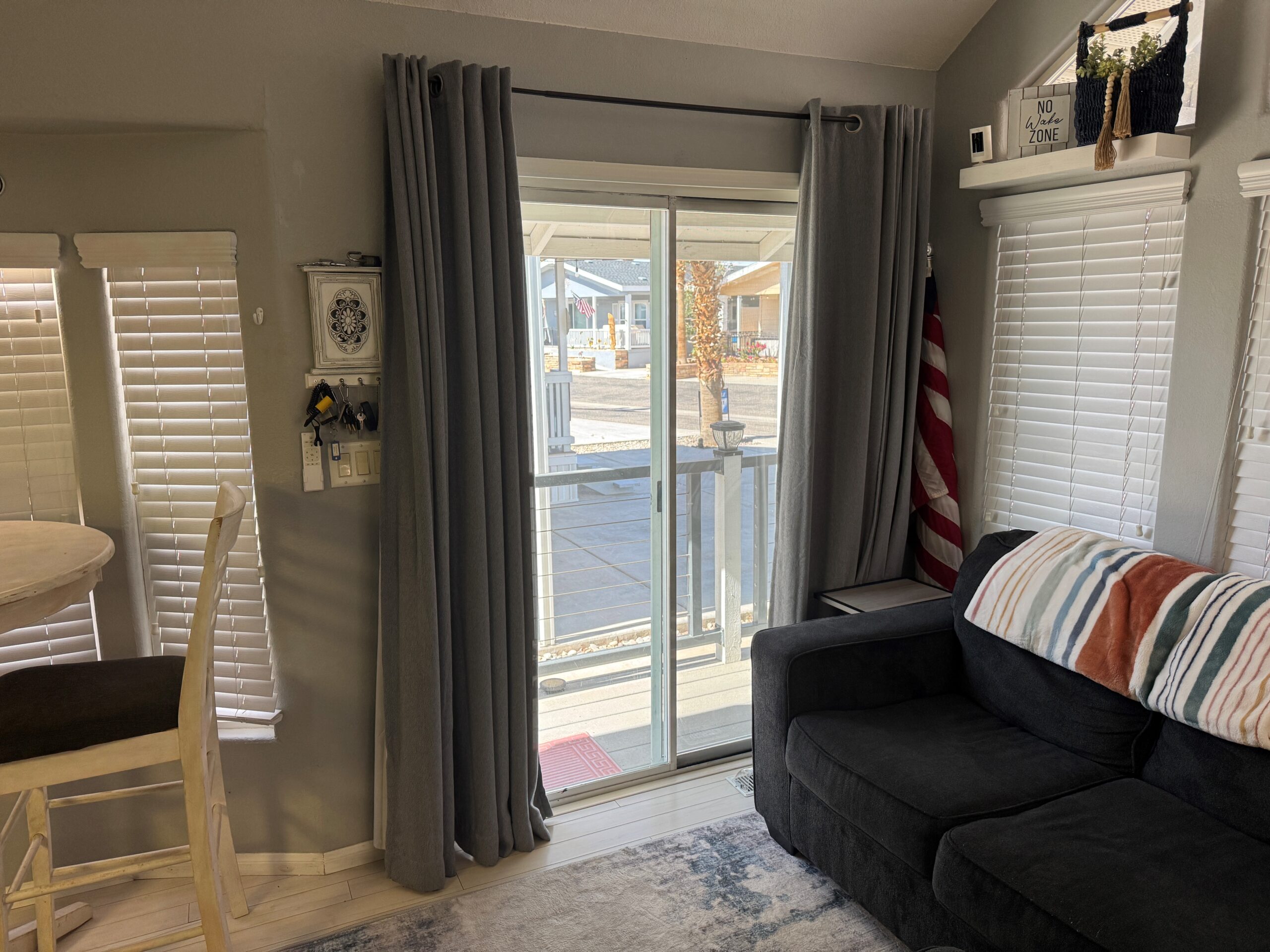 Outdoor living is a standout, with a large, fully furnished covered porch featuring sleek modern railings, a vaulted ceiling with decorator ceiling fan, Smart TV, outdoor string lighting, a spacious patio perfect for entertaining. There is also a storage shed at the back of the home, wood-burning fire pit and low-maintenance landscaping complete the outdoor setting. Additional highlights include luxury vinyl flooring throughout, window coverings, electronic keyless entry, an indoor/outdoor stereo and speaker system, Wi-Fi thermostat, new washer/dryer combo, and a covered lighted carport.