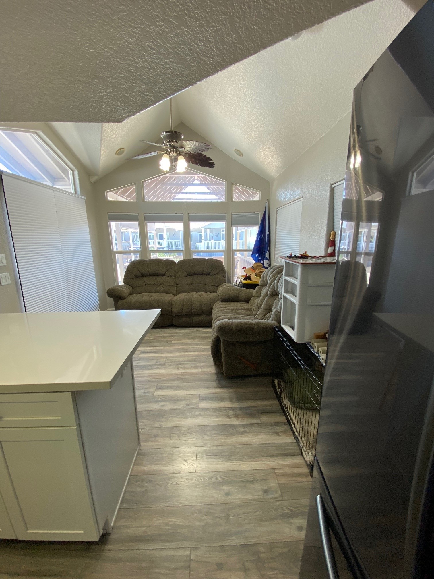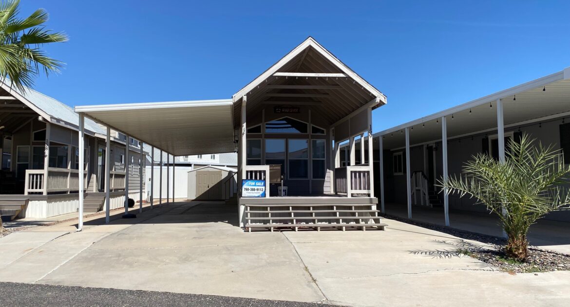 Charming Park model home located in the desirable Palms River Edge Resort on the Colorado River. This fully furnished home is located on Ramp Road and offers easy access to all the recreation the river and desert have to offer. This low-maintenance property features an oversized covered front porch—perfect for relaxing outdoors. Inside, the bright living room showcases a vaulted ceiling, a wall of windows for natural light, a large screen TV, and a decorator ceiling fan. The kitchen includes a black cooktop, refrigerator, microwave, stainless steel sink with single-lever faucet, and a convenient eat-in snack bar.