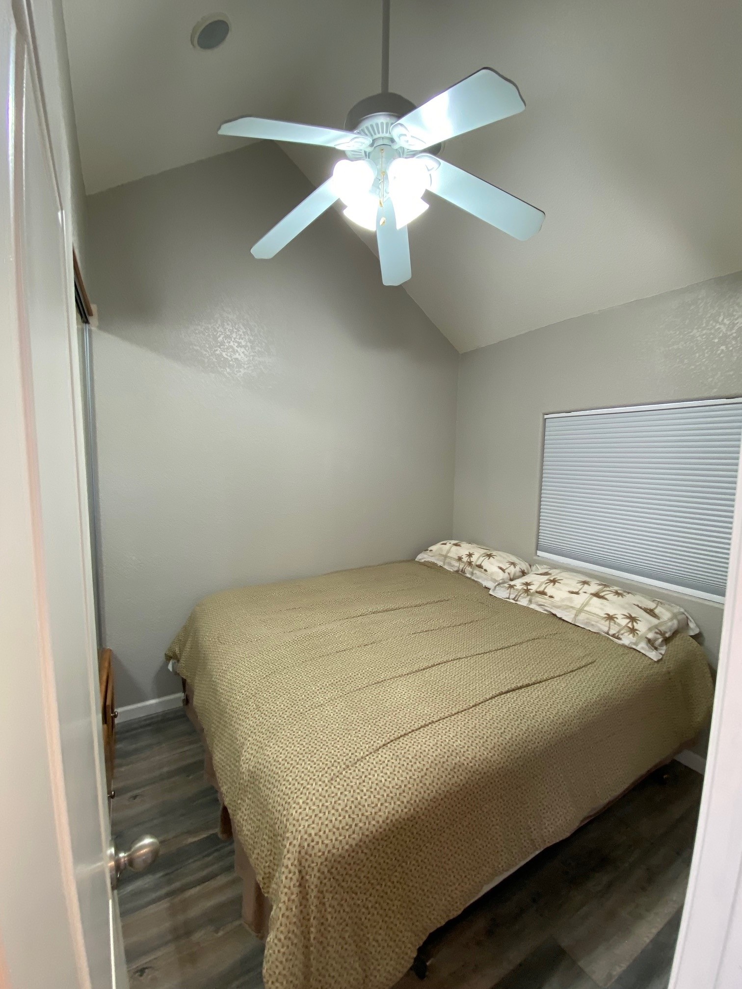 The bedroom offers a ceiling fan, closet, and built-in storage, while the bathroom features a shower/tub enclosure and decorator vanity. A carpeted loft provides additional sleeping space with a queen bed and day bed, plus extra storage under the stairs. The home also includes laminate flooring on the main level, window coverings throughout, washer/dryer hookups, and an electric water heater.
